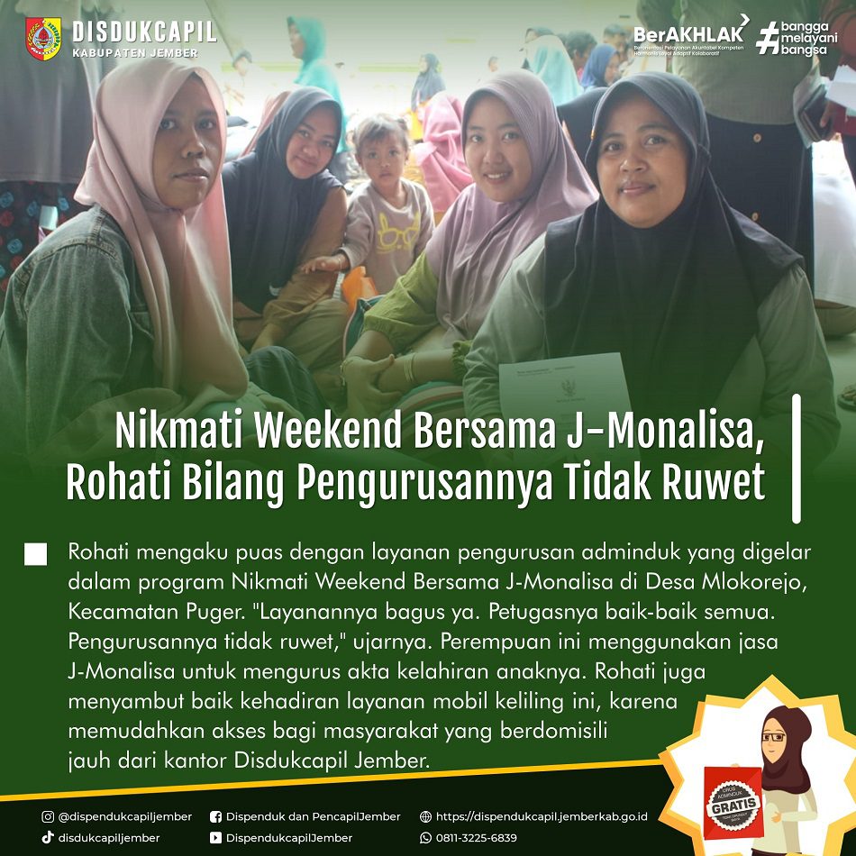 Sebagaimana diketahui, Dinas Kependudukan dan Pencatatan Sipil (Disdukcapil) Kabupaten Jember menggelar program Weekend Bersama J-Monalisa. Pada Sabtu 3 Februari 2024, J-Monalisa berada di Kantor Desa Mlokorejo, Kecamatan Puger.